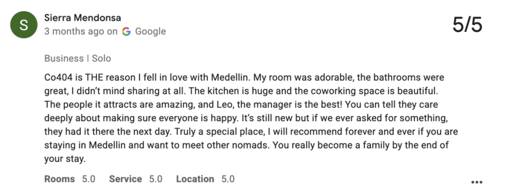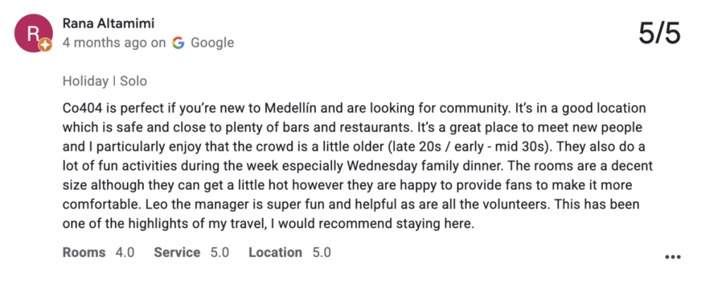 Co404 Medellin has a co-working area, a big communal kitchen with free tea and coffee all day and a rooftop terrace with amazing views of the city. You can work from any of the area’s and the internet coverage is very good. The coworking is equipped with plugs in all tables and 7 private meeting booths with a built in light and fan.